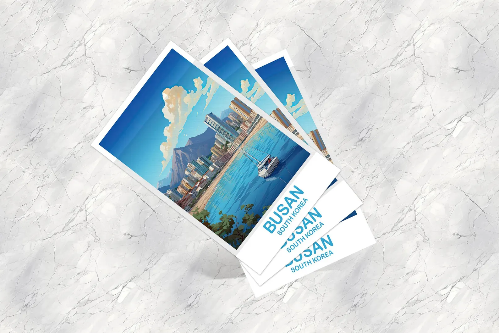 This artwork highlights the sweeping curve of Haeundae Beach dotted with colorful umbrellas, the architectural lines of the Gwangandaegyo Bridge stretching across Maengjong Bay, and the lantern-lit lanes of Gamcheon Culture Village perched on the hillside. Whether you’ve explored the tranquil Haedong Yonggungsa Temple, indulged in fresh seafood at Jagalchi Market, or watched the sunset from the cliffside cafe, this postcard captures Busan’s dynamic energy and coastal warmth.