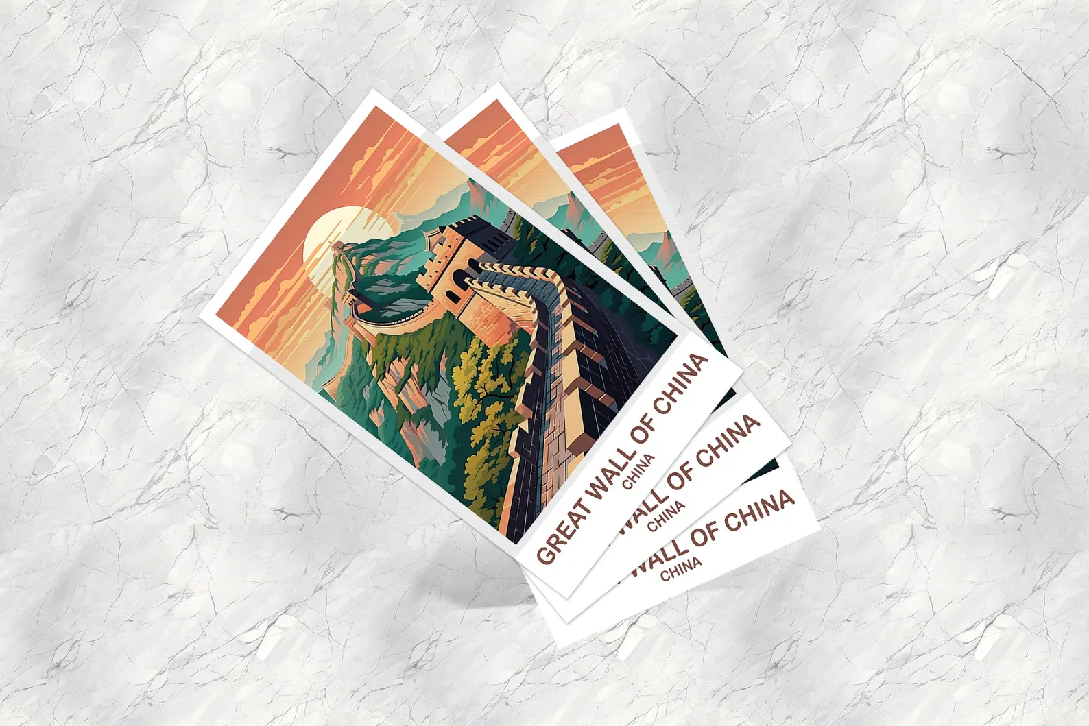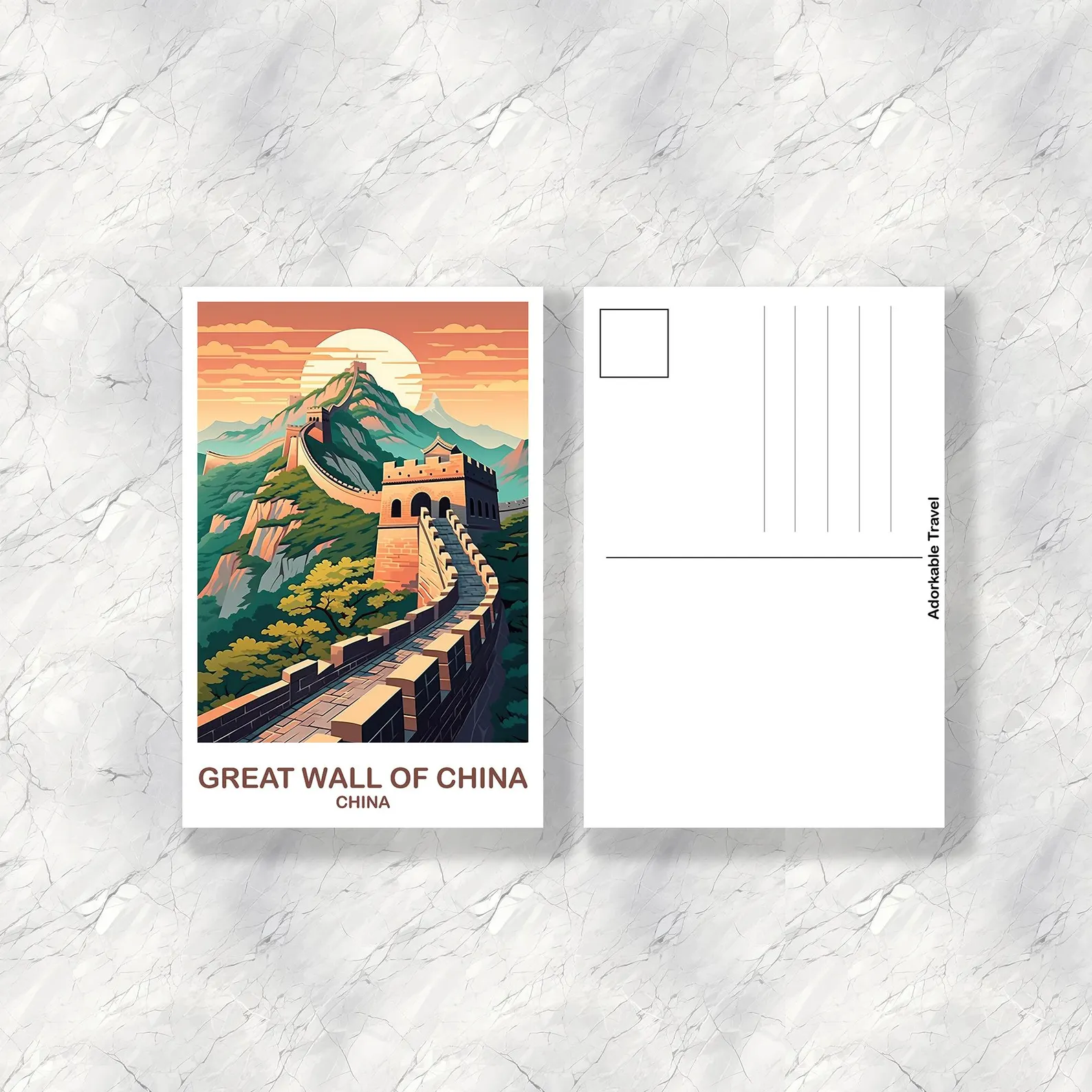 This artwork features the Wall’s winding silhouette cutting through misty hills, ancient stone watchtowers, and rugged mountain ridges fading into the horizon. Whether you’ve walked its historic steps at Mutianyu, stood above the clouds at Jinshanling, or simply admired its legacy, this postcard captures the majesty of a civilization’s strength.