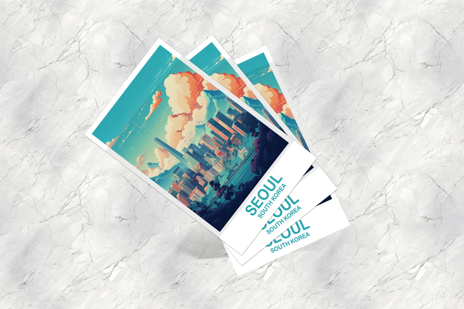 The postcard features an iconic view of Seoul’s skyline, with its towering skyscrapers, colorful neighborhoods, and the majestic N Seoul Tower rising above the cityscape. The vibrant colors, bustling street life, and blend of ancient traditions and contemporary trends create a harmonious and inviting scene that captures the essence of Seoul.